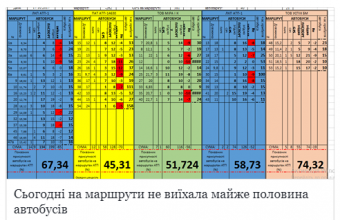 У громадській організації «За якісний транспорт» повідомили у вівторок, 17 жовтня, що сьогодні, з 8:15 до 9:05 замість 643 автобусів, які зобов’язалися відправляти на маршрути ТОВ «Успіх БМ» на маршрути 48, №49, №50, №51, №53, ПАТ «АТП-14630» – на маршрут №54, а ЛКП «АТП-1» – на маршрути №№1-47, виїхали лише 381 автобус. Натомість на на території автопарків залишилися 40, а за межами маршрутів перебувають 21 автобус.