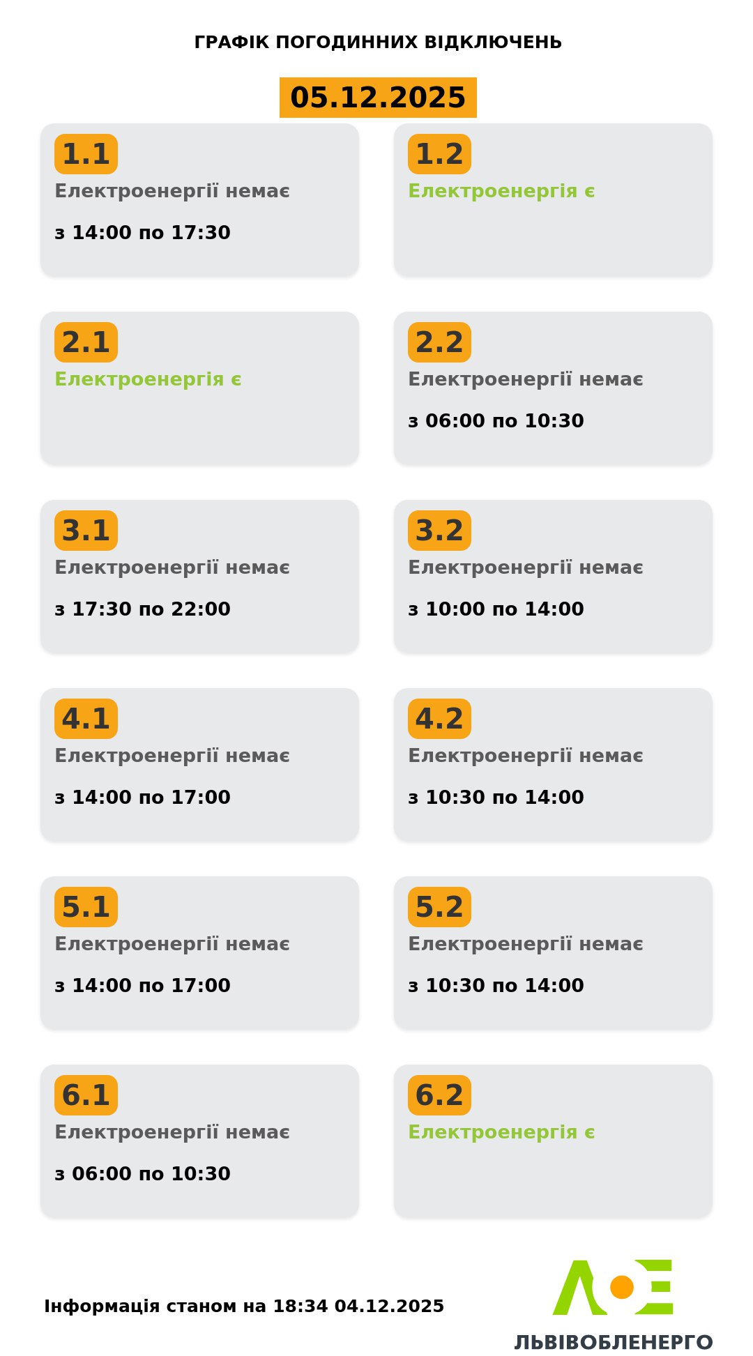 А сьогодні після 17.30 графік вимкнень електроенергії на Львівщині не діятиме.