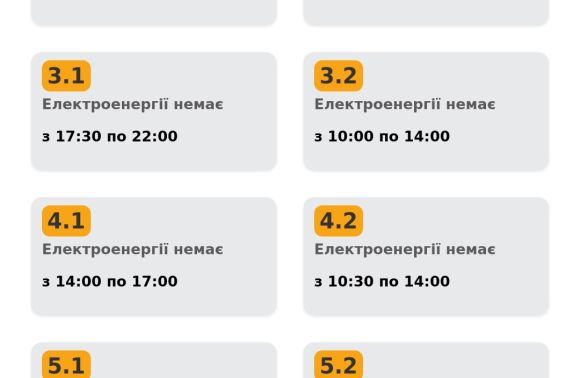 Підгрупи споживачів 1.2, 2.1, 6.2 матимуть у п'ятницю безперебійне електропостачання.