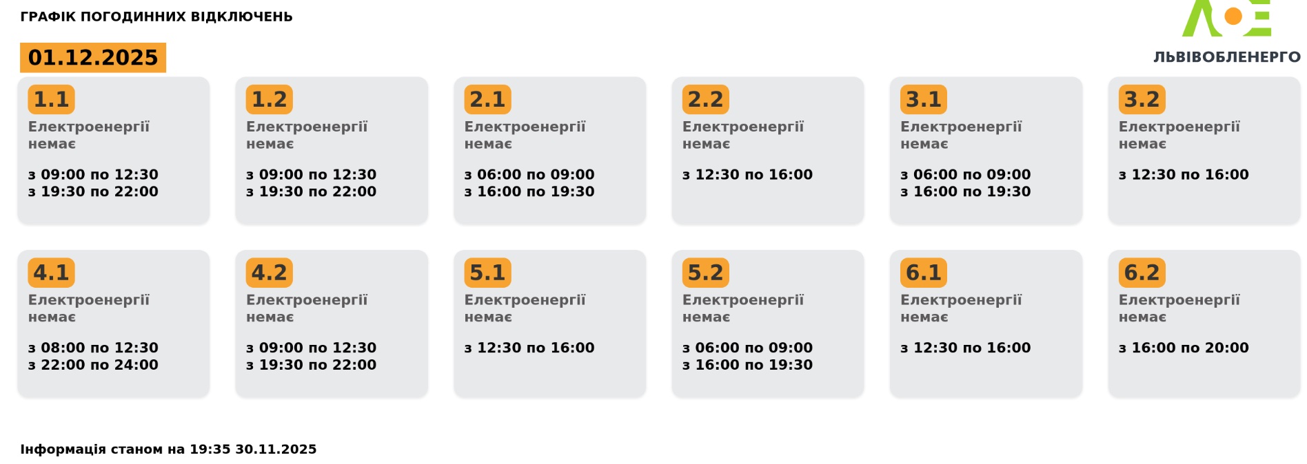 Графік погодинного вимкнення електроенергії у Львівській області у понеділок, 1 грудня: