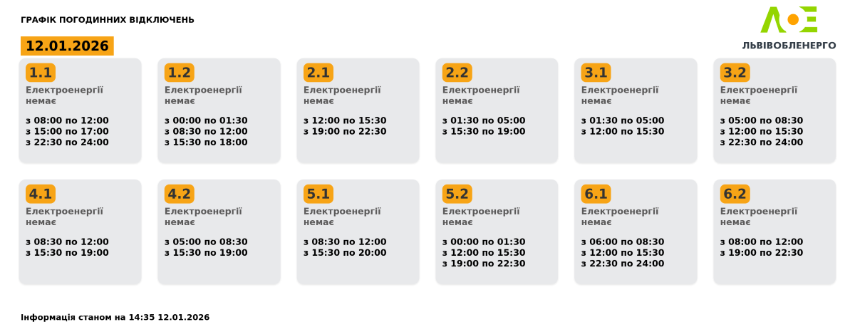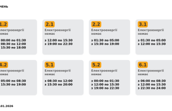 Група 1.2. Електроенергії немає з 00:00 до 01:30, з 08:30 до 12:00, з 15:30 до 18:00.