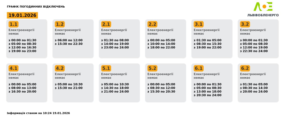 Львівобленерго опублікувало новий графік погодинних відключень на 19.01.2026, пише DailyLviv.com.