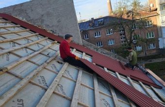 Ремонтна бригада монтує металеве покриття даху у будинку на вул. О. Степанівни, 48.