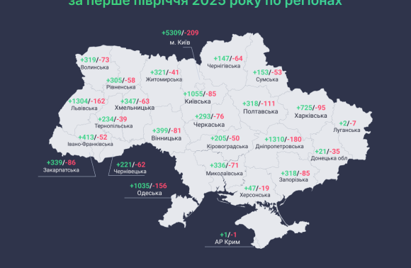 Другу сходинку за кількістю зареєстрованих компаній у першому півріччі 2025 року посіла Дніпропетровська область – 1310 нових. На Львівщині було зареєстровано 1304 компанії. У Київській області 1055 компаній. Замикає пʼятірку лідерів Одеська область з 1035 новими компаніями.