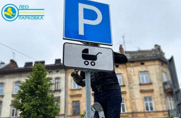 У Львові на майданчиках ЛеоПарковки розпочали встановлювати спеціальні таблички «Місце для паркування автомобілів батьків з дітьми».