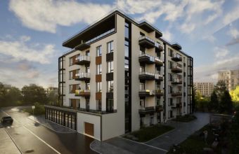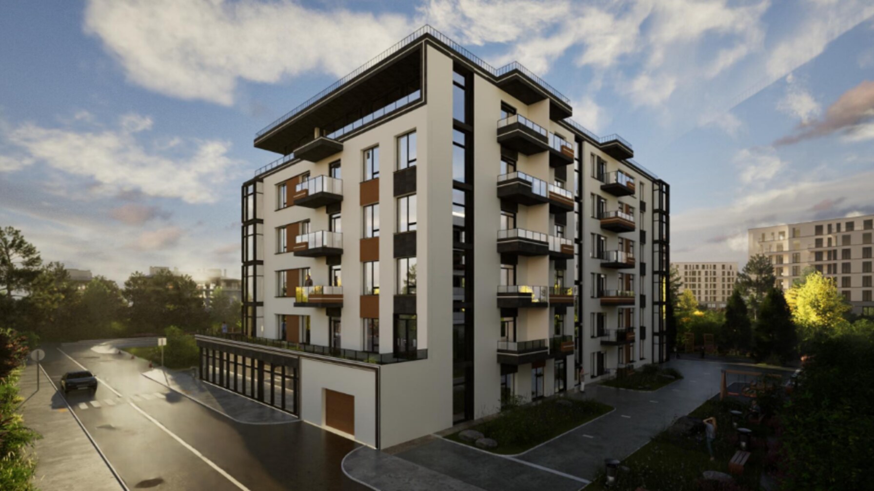Візуалізація багатоповерхівки на вул. Земельній, 4 у Львові. Перші два поверхи з великими вікнами для громадських об’єктів, решта - житлові квартири з відкритими балконами та зеленню