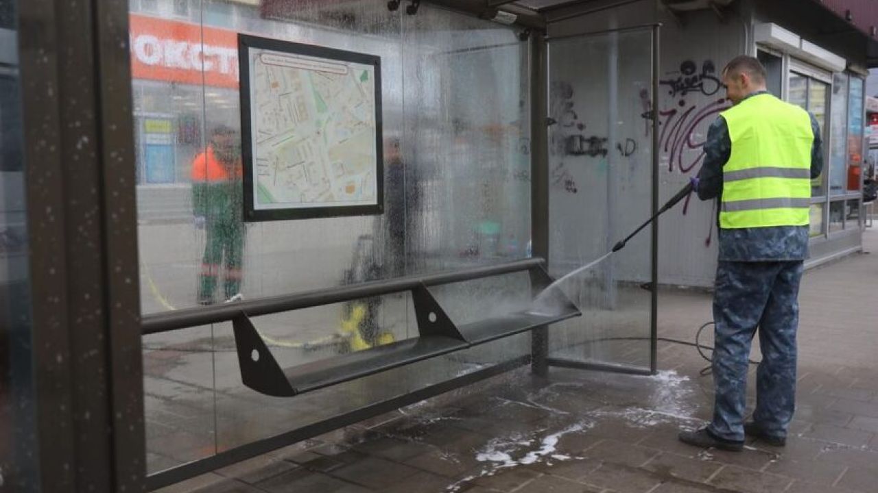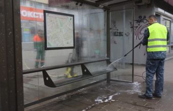 Працівники комунальних служб усіх районів міста миють павільйони зупинок для очікування громадського транспорту.