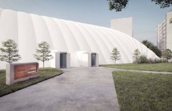 Проєкт критої льодової арени білого кольору з двома входами. Поруч є зелена територія, ростуть дерева та кущі