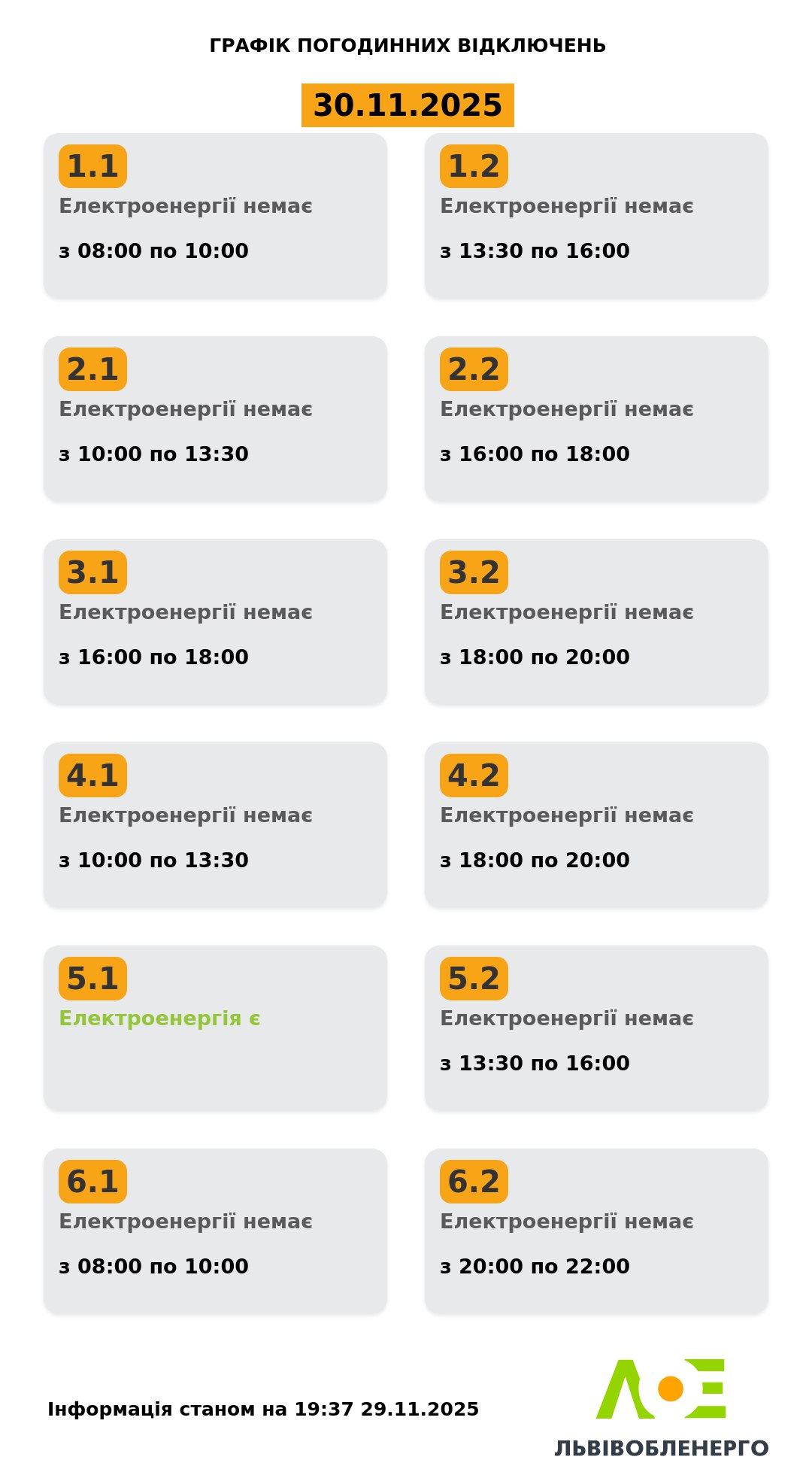 Про графік погодинних відключень електроенергії у Львівській області у неділю, 30 листопада, повідомило ПрАТ «Львівобленерго», пише DailyLviv.com.