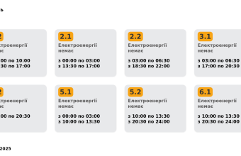 Група 2.1. Електроенергії немає з 00:00 до 03:00, з 13:30 до 17:00.