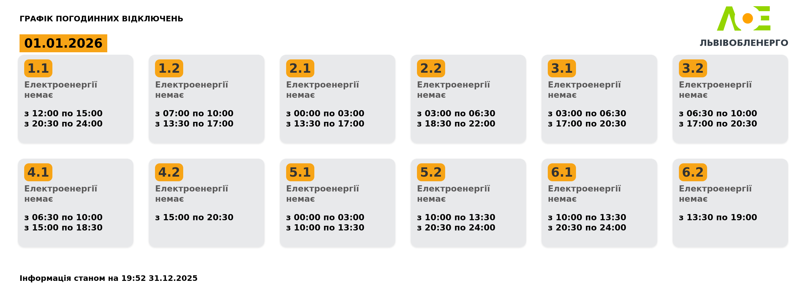 Львівобленерго оприлюднило графік погодинних відключень світла на 01.01.2026, пише DailyLviv.com.