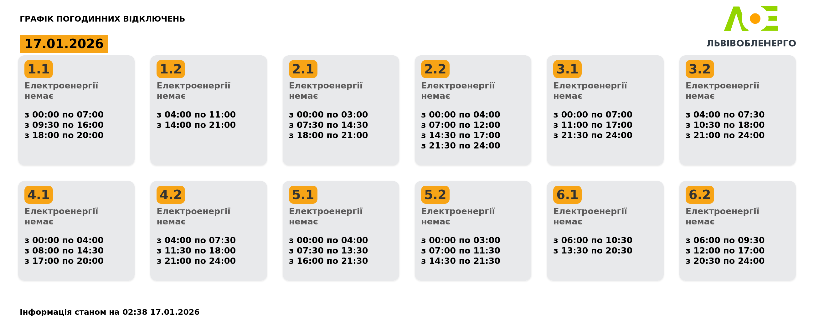 Графік вимкнення електроенергії на Львівщині 17 січня станом на 02.38: