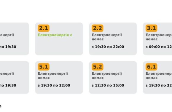 Групи 2.2, 5.1 та 6.1 електроенергії не буде з 19:30 до 22:00.