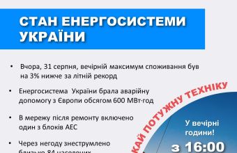 Зазначають, що 31 серпня під час піку споживання попит на електроенергію був всього на 3% нижчим за літній рекорд 29 серпня.