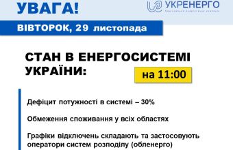 Станом на 11:00 29 листопада виробники електроенергії забезпечують 70% споживання електроенергії в Україні. Дефіцит потужності наразі складає 30%.