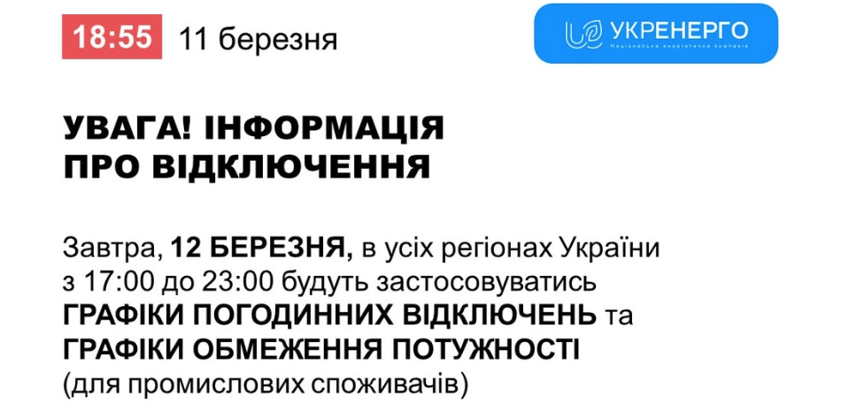 Завтра, 12 березня, у всіх регіонах України з 17:00 до 23:00 будуть застосовуватись графіки погодинних відключень (для побутових споживачів) та графіки обмеження потужності (для промислових споживачів).