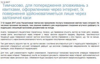 У прес-центрі «Укрзалізниці» повідомили сьогодні, 13 грудня, що вона тимчасово призупиняє послугу повернення квитків через інтернет, а також пояснили: «На численні прохання пасажирів, таке рішення прийнято для недопущення створення штучного дефіциту та подальших спекуляцій проїзними документами на поїзди.