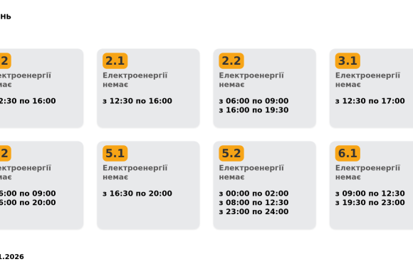 Група 1.1. Електроенергії немає з 02:00 до 03:00, з 12:30 до 16:30.