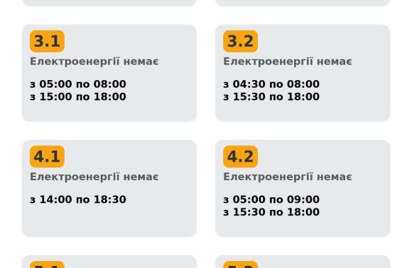 Згідно з графіком, двічі світло вимикатимуть десяти групам з 12. Вимкнення будуть тривалими. Наприклад, у групі 2.2 електроживлення не буде з 14.00 до 18.30 і з 22.00 до 24.00.