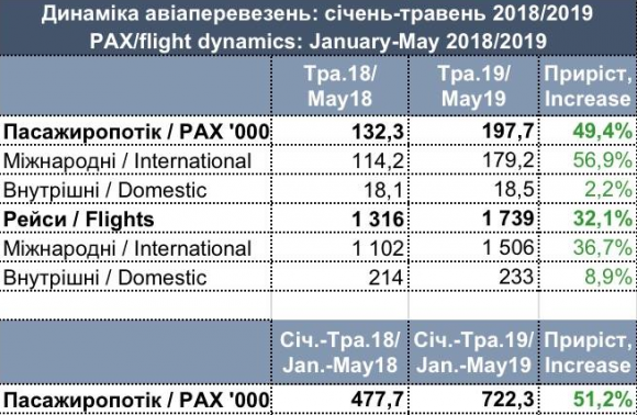 «Загалом, за січень-травень 2019 р. пасажиропотік зріс на 51,2% в порівнянні з показником аналогічного періоду минулого року (477,7 тисячі пасажирів) і досяг позначки в 722,3 тисячі пасажирів. Кількість рейсів зросла на 28,9% (з 5290 до 6820)», – поінформували також в аеропорту «Львів».