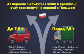 Рух транспортних засобів повною масою до 7,5 тонн з 1 вересня буде скеровуватись на менші пункти пропуску: "Устилуг-Зосин", "Грушів-Будомеж", "Смільниця-Кросценко", "Угринів-Долгобичув". Про це домовилися у ході двосторонніх зустрічей представники митних служб, Міністерств інфраструктури і транспорту України та Республіки Польща.