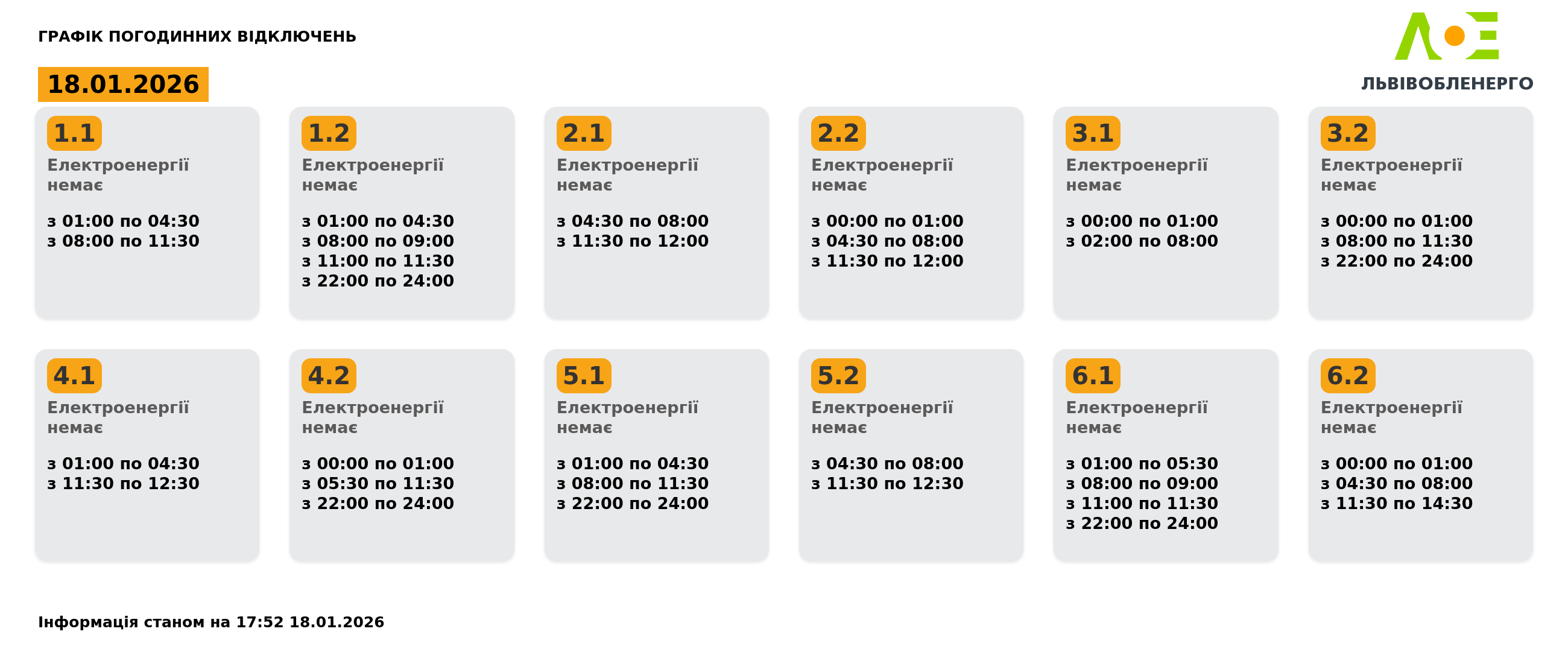Львівобленерго ввечері скоригувало графік погодинних відключень на 18.01.2026, пише DailyLviv.com.