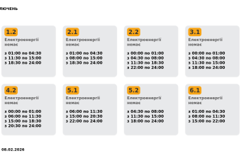 Група 3.2. Електроенергії немає з 00:00 до 01:00, з 06:00 до 11:30, з 15:00 до 22:00.