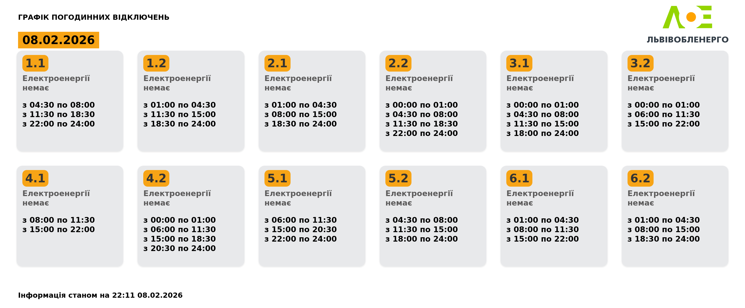 Львівобленерго пізно ввечері оновило графік погодинних відключень на 08.02.2026, пише DailyLviv.com.