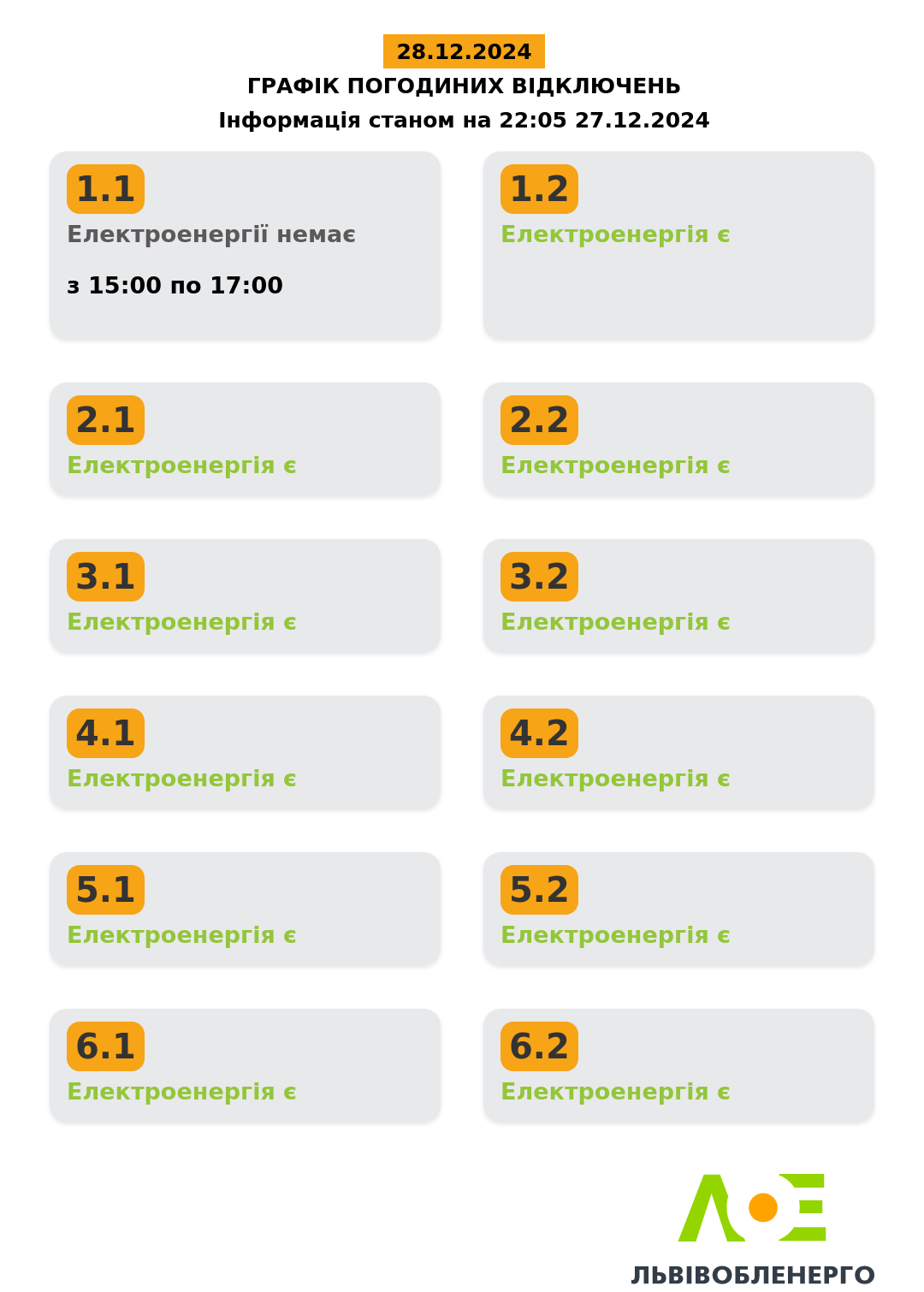 Про це повідомило ПрАТ «Львівобленерго», пише DailyLviv.com. Група побутових споживачів 1.1 не матиме у суботу, 28 грудня, світла з 15 до 17 години.
