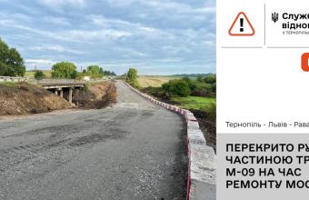 7 серпня буде заборонено проїзд усіх видів транспорту ділянкою траси М-09 Тернопіль Львів – Рава-Руська через річку Стрипа на обході міста Зборів (км 31+986).