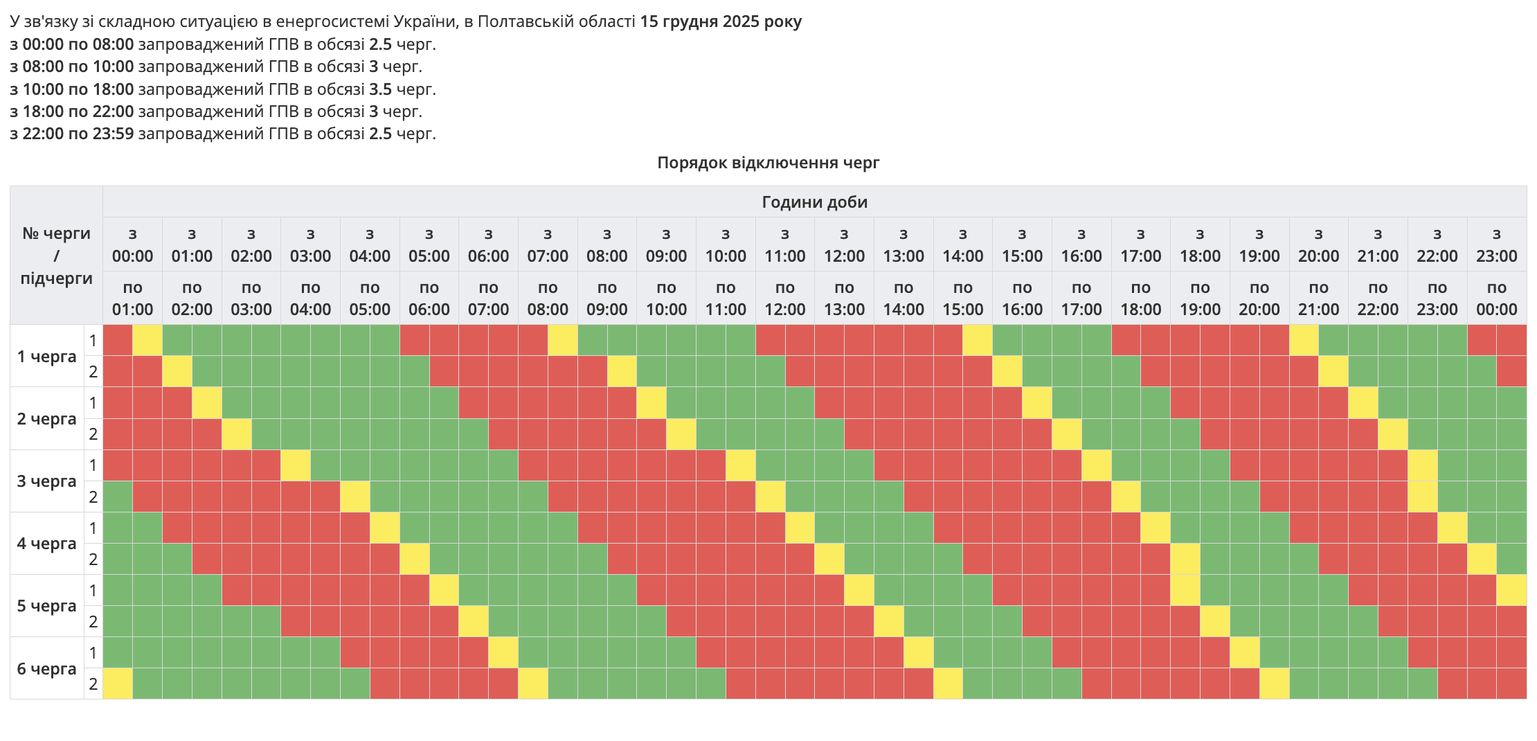 У зв'язку зі складною ситуацією в енергосистемі України, в Полтавській області 15 грудня 2025 року.