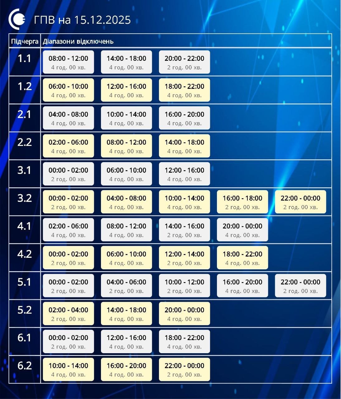 Завтра, 15 грудня, діятимуть графіки погодинних відключень відповідно до обсягів, доведених командою з НЕК "Укренерго".