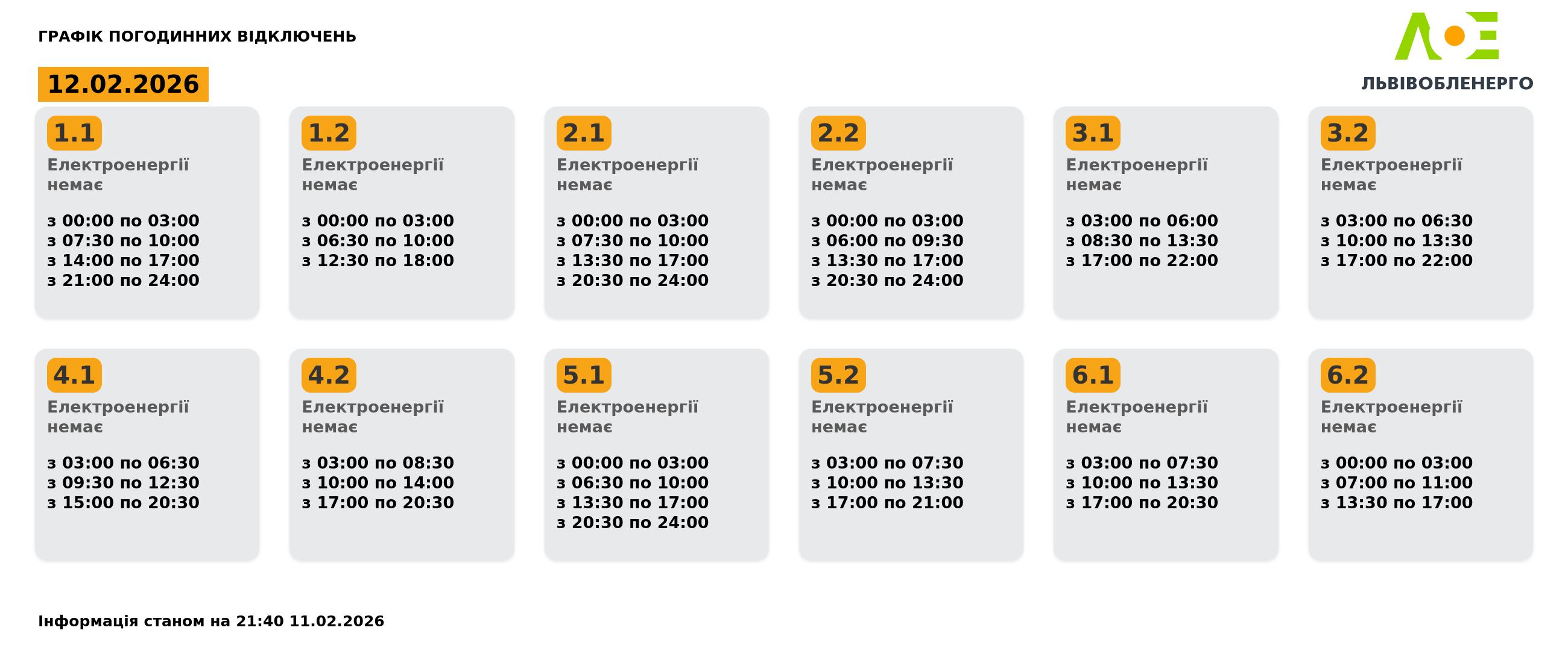 Графік погодинних відключень 12 лютого станом на 21.40 11 лютого (таблиця):