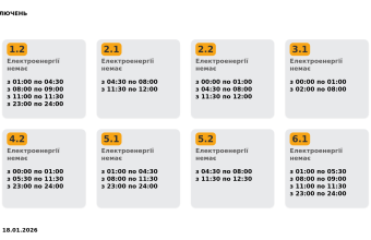 Група 6.2. Електроенергії немає з 00:00 до 01:00, з 04:30 до 08:00, з 11:30 до 14:30.