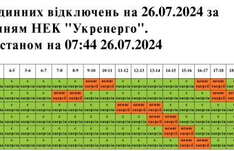 За оновленим графіком 26 липня буде припинено електропостачання для шести груп споживачів у такі години: