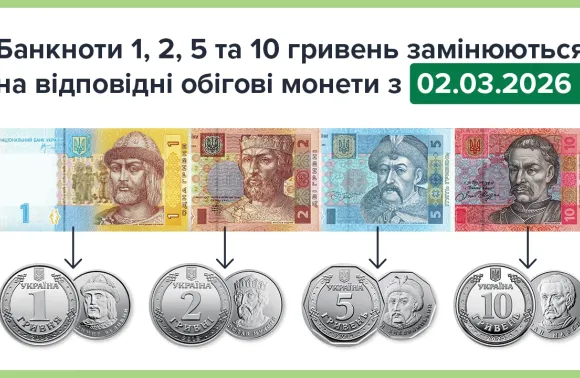 Від 2 березня 2026 року банкноти номіналами 1, 2, 5 та 10 гривень зразків 2003–2007 років замінюються на відповідні обігові монети.
