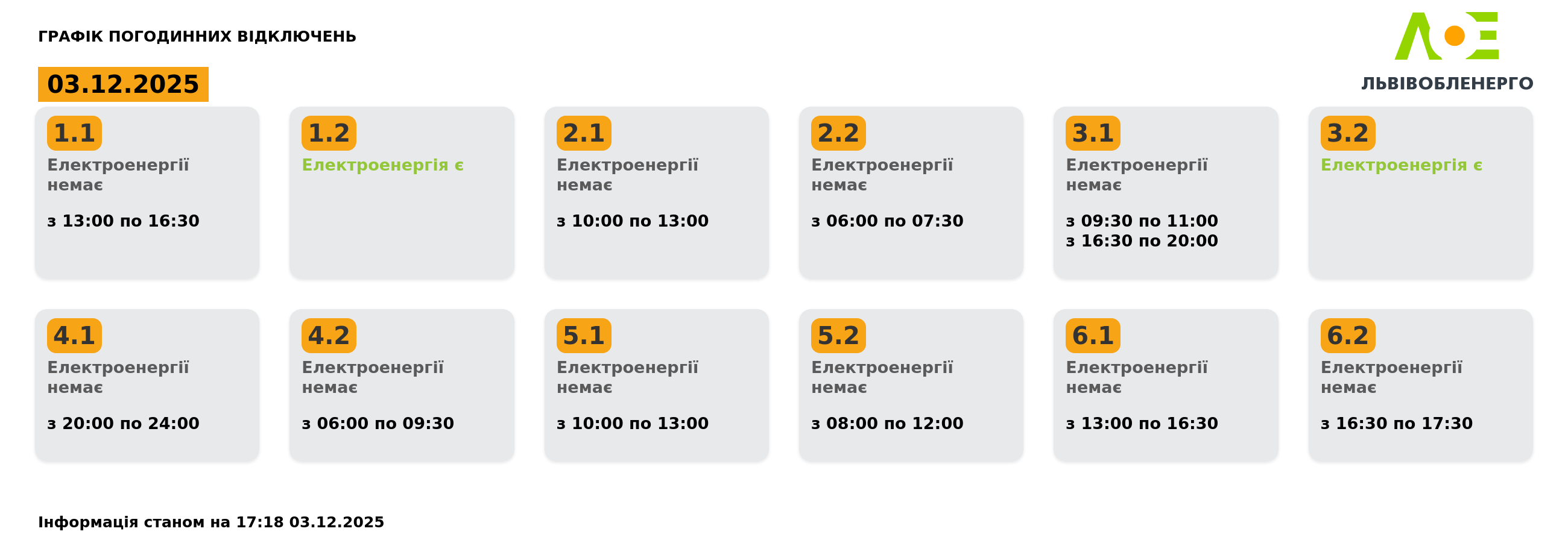 Група 3.1. Електроенергії немає з 09:30 до 11:00, з 16:30 до 20:00.