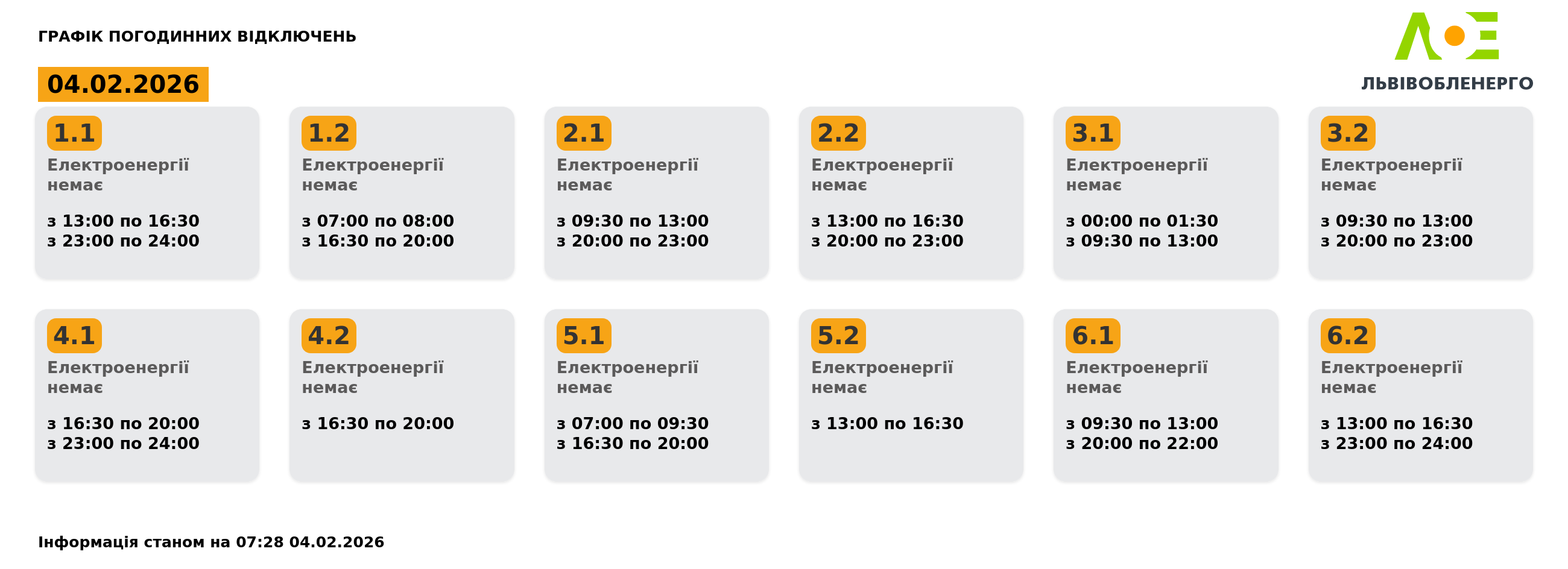 Початкова версія ГПВ на Львівщині 4 лютого була опублікована вчора: Графік відключення на Львівщині 4 лютого. Більшість груп без світла по 6–7 годин