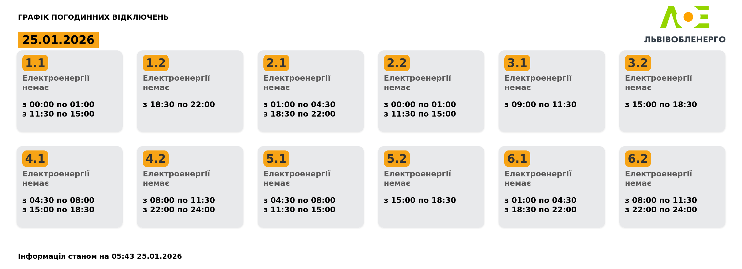 Графік ПрАТ «Львівобленерго» погодинних відключень на 25.01.2026