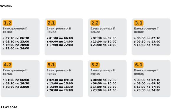 Група 1.1. Електроенергії немає з 02:30 до 06:30, з 09:30 до 16:30, з 20:00 до 24:00.