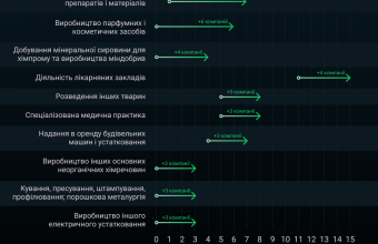 Однак є низка галузей, динаміку розвитку яких можна оцінювати як позитивний тренд, — реєстрацій нових компаній у них зафіксовано навіть більше, ніж у той же час рік тому. Через значне посилення уваги мільйонів споживачів до стану власного здоров’я та профілактики захворювань ринок медичних послуг і фармпродукції відчуває стрімкий підйом. Лідерами за кількістю новостворених юросіб стали компанії, основний вид діяльності яких: