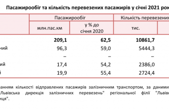 У січні 2021 року усіма видами транспорту виконано пасажирообіг в обсязі 209,1 млн. пас. км, що на 37,5% менше від обсягу січня 2020 року.
