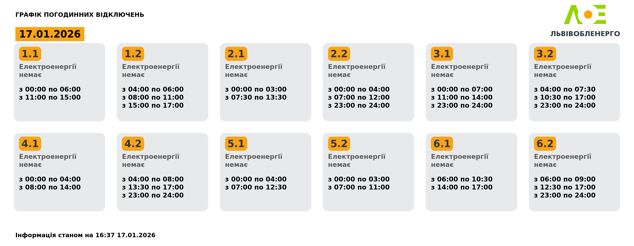 Про це повідомило ПрАТ «Львівобленерго» в оновленому о 16.37 варіанті графіка на 17 січня, пише DailyLviv.com.