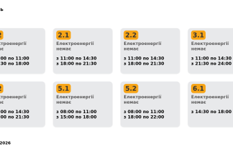Група 2.1. Електроенергії немає з 11:00 до 14:30, з 18:00 до 21:30.