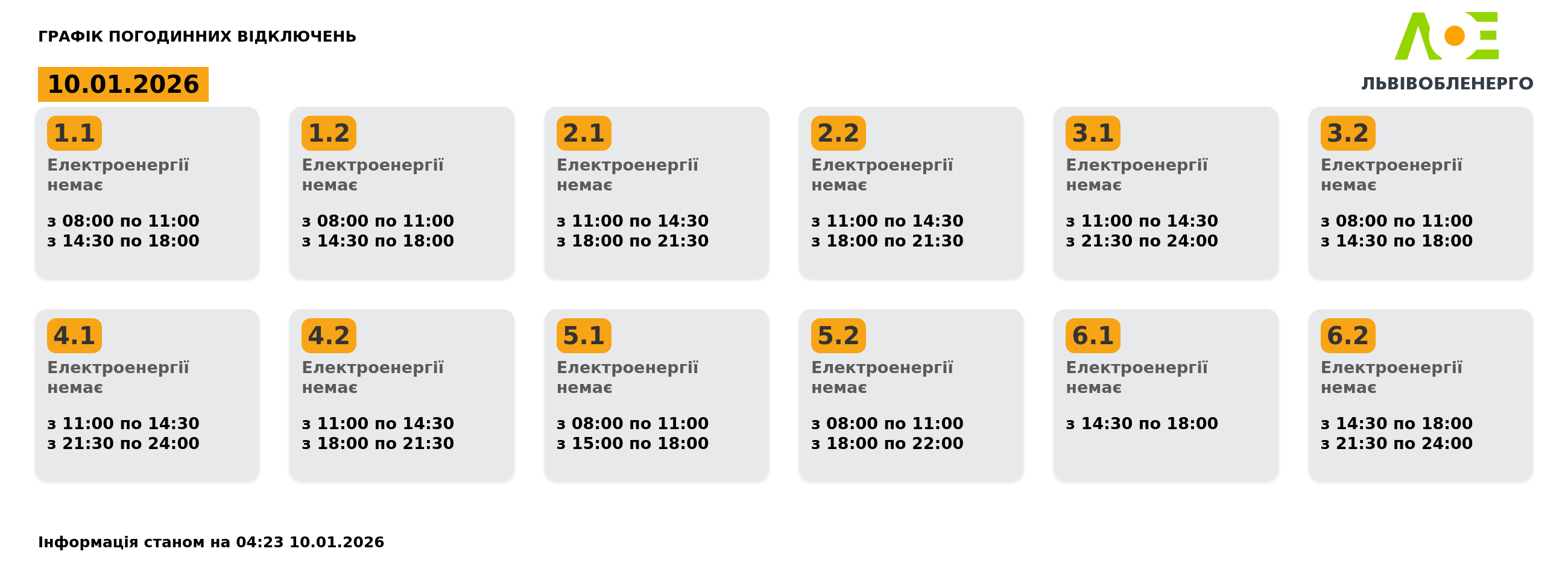 Останній варіант графіка погодинних відключень на 10 січня у Львівській області (станом на 04:23 10 січня):