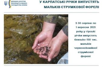З 30 серпня по 1 вересня 2021 року зариблюватимуться гірські річки на території Чернівецької та Івано-Франківської областей. У річки Прут, Дністер та їх притоки заплановано випустити понад 145 тис. екз. струмкової форелі.