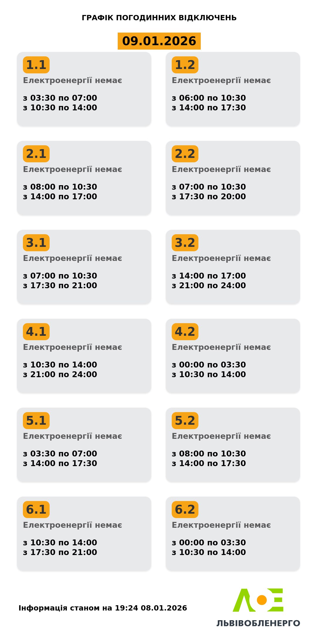 Графік погодинних відключень на Львівщині 9 січня 2026 року станом на 19:24 8 січня.