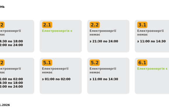 Група 4.2. Електроенергії немає з 01:00 до 02:00, з 14:30 до 18:00, з 22:00 до 24:00.