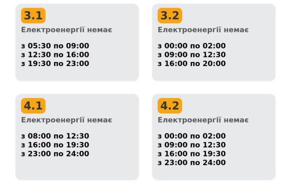 Група 3.1. Електроенергії немає з 05:30 до 09:00, з 12:30 до 16:00, з 19:30 до 23:00.