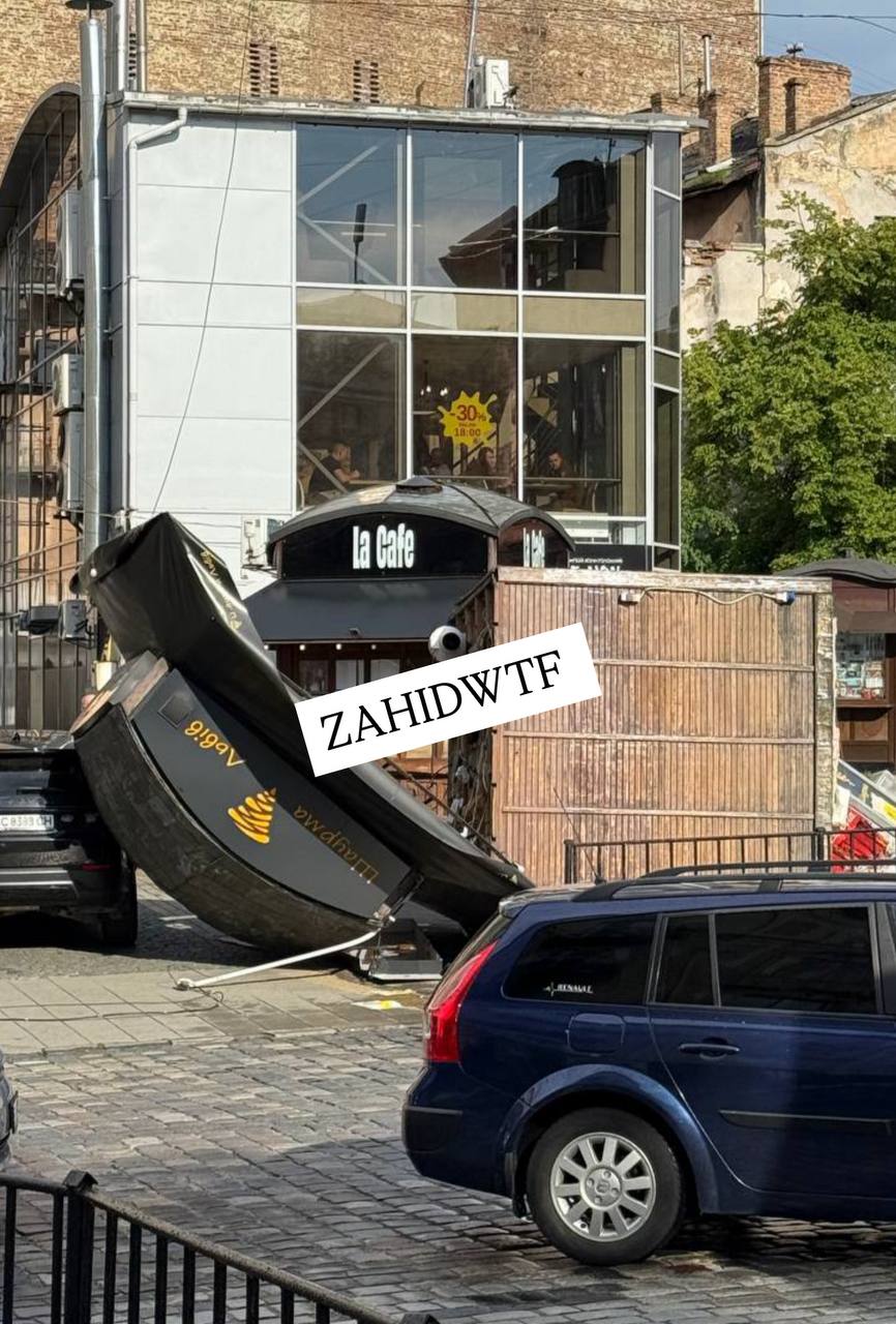 Одні повідомляють, що порив вітру зірвав дах кіоску, і він упав на припаркований поруч автомобіль. Інші стверджують, що кіоск завалився після того, як у нього в'їхав бус.